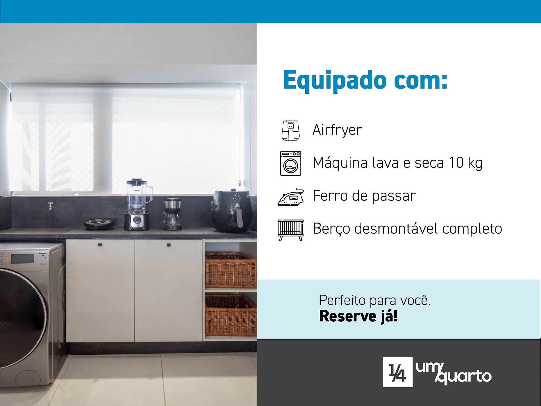 Conta com 1 Suíte com cama de casal e 1 Sofá Cama, 1 Quarto com 2 camas de solteiro, cozinha equipada, Airfryer, mesa de jantar, banheiros, sala de estar, maquina lava e seca 10kg, berço desmontável, ar condicionado em ambos quartos e internet.