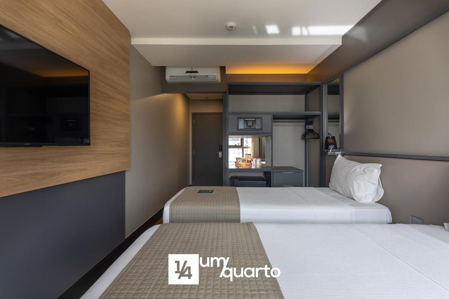 São equipados com 2 camas de solteiro, bancada de trabalho, ar condicionado split, cofre eletrônico e para laptop, frigobar, secador de cabelo e TV 43" a cabo e WI-FI gratuito.