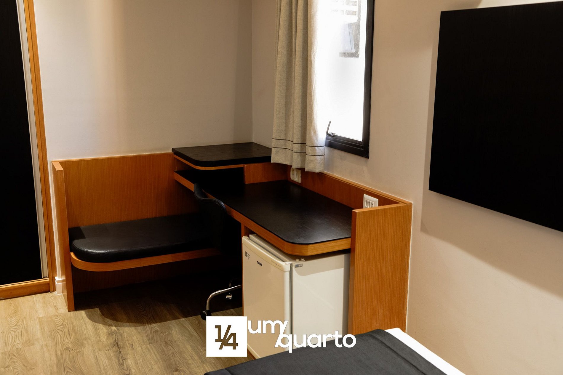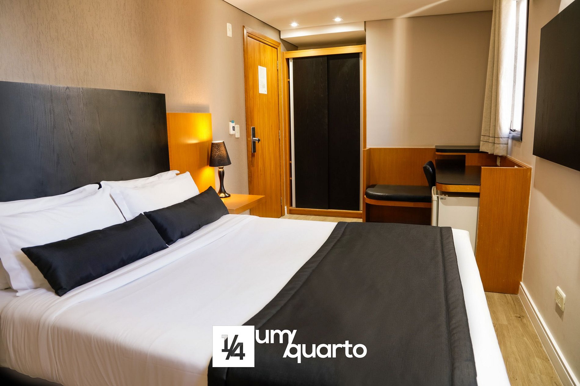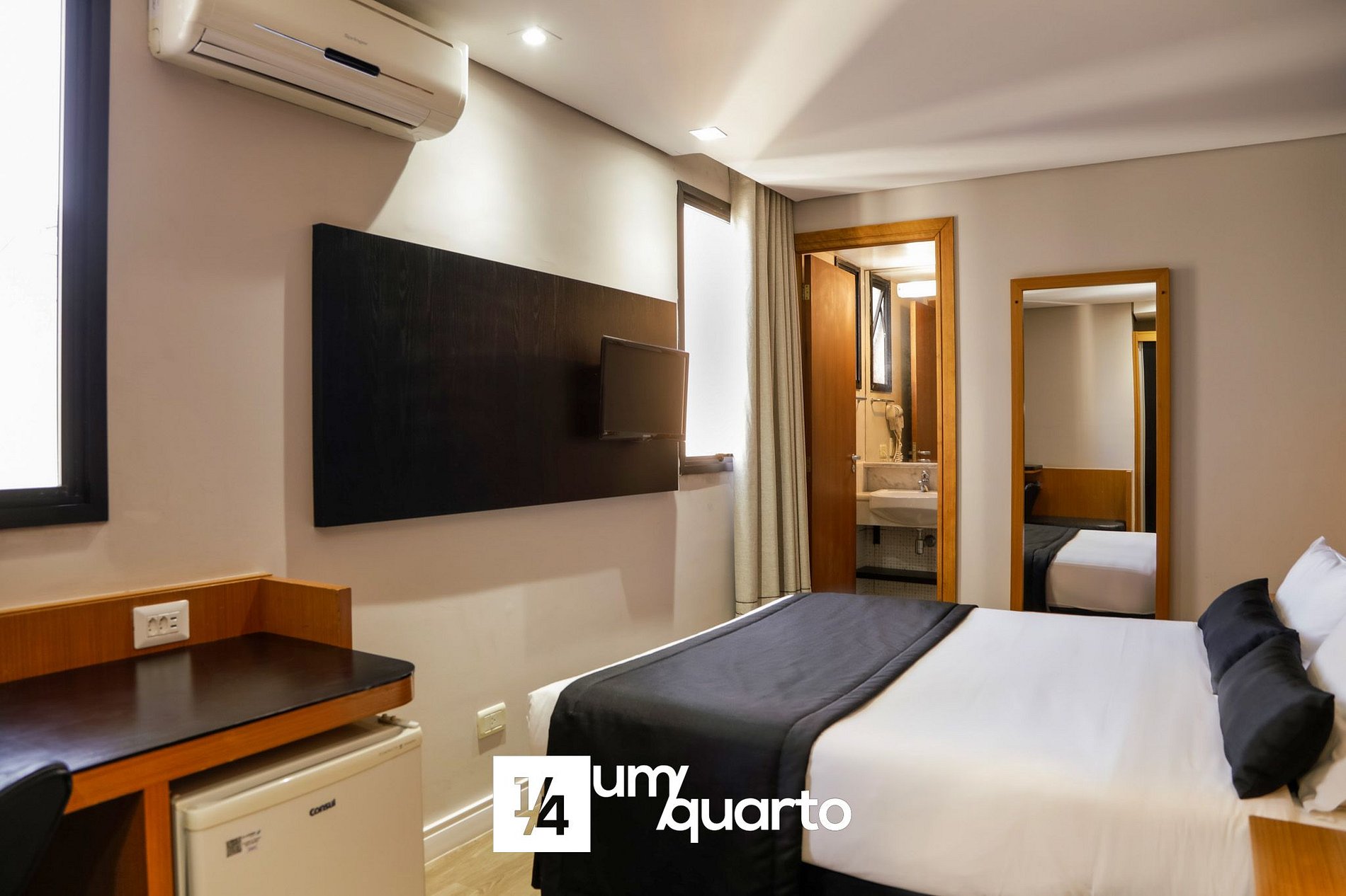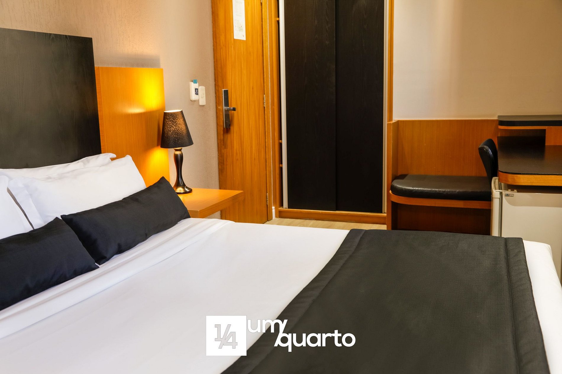 Quarto com decoração moderna, equipado com 1 cama de casal, ar condicionado split, TV a cabo, mesa de trabalho e WiFi gratuito.