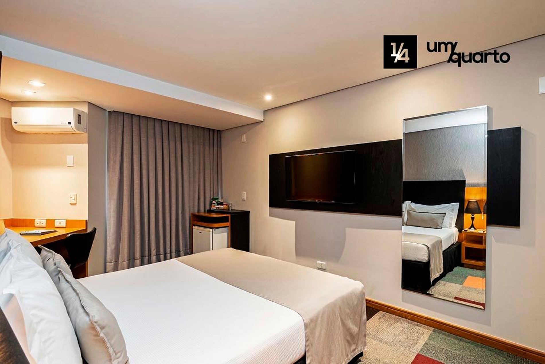 Quarto com decoração moderna, equipado com 1 cama de casal, ar condicionado split, TV a cabo, mesa de trabalho e WiFi gratuito.