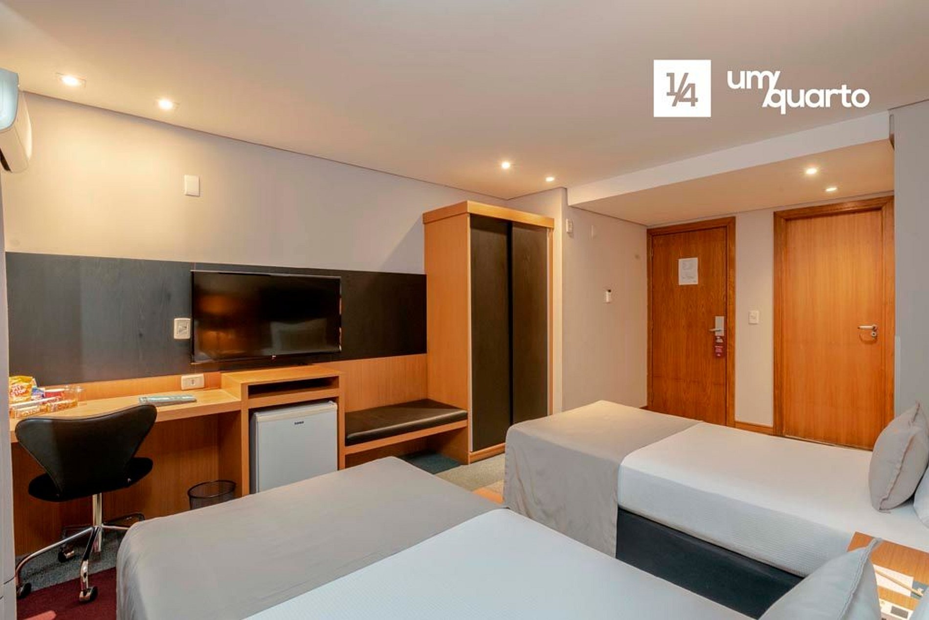 Quarto com decoração moderna, equipado com 2 camas de solteiro, ar condicionado split, TV a cabo, mesa de trabalho e WiFi gratuito.