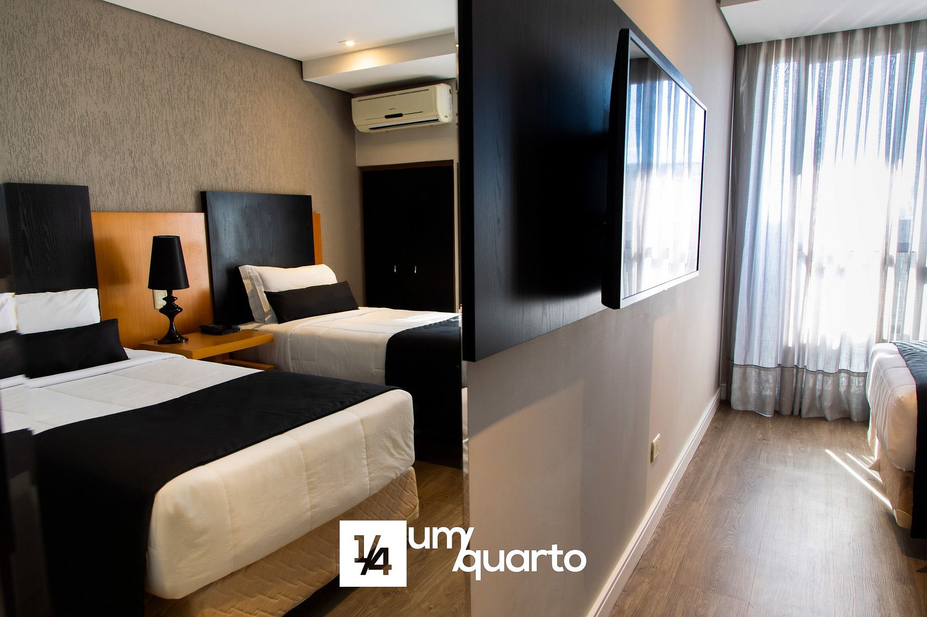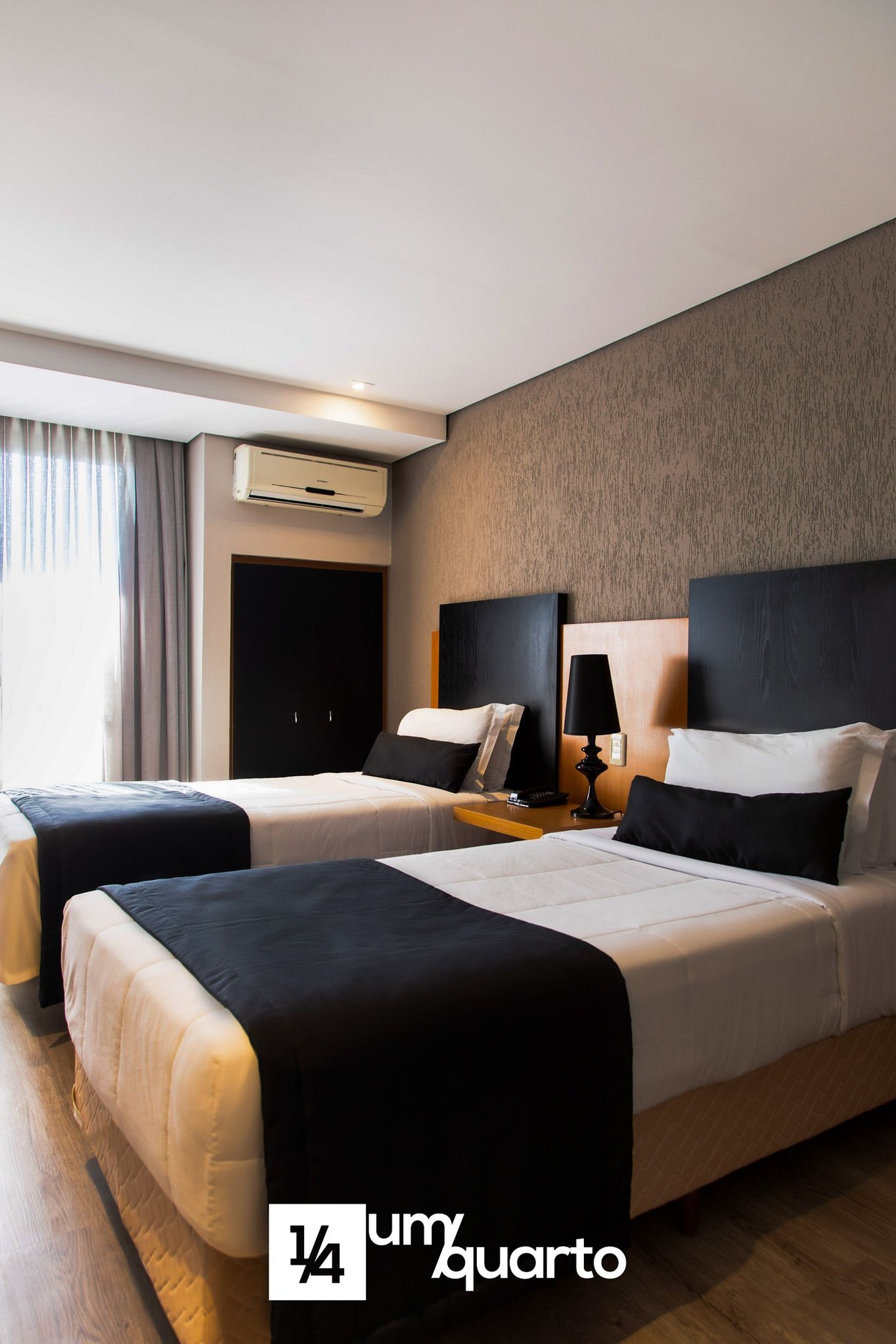 Quarto com decoração moderna, equipado com 2 camas de solteiro, ar condicionado split, TV a cabo, mesa de trabalho e WiFi gratuito.