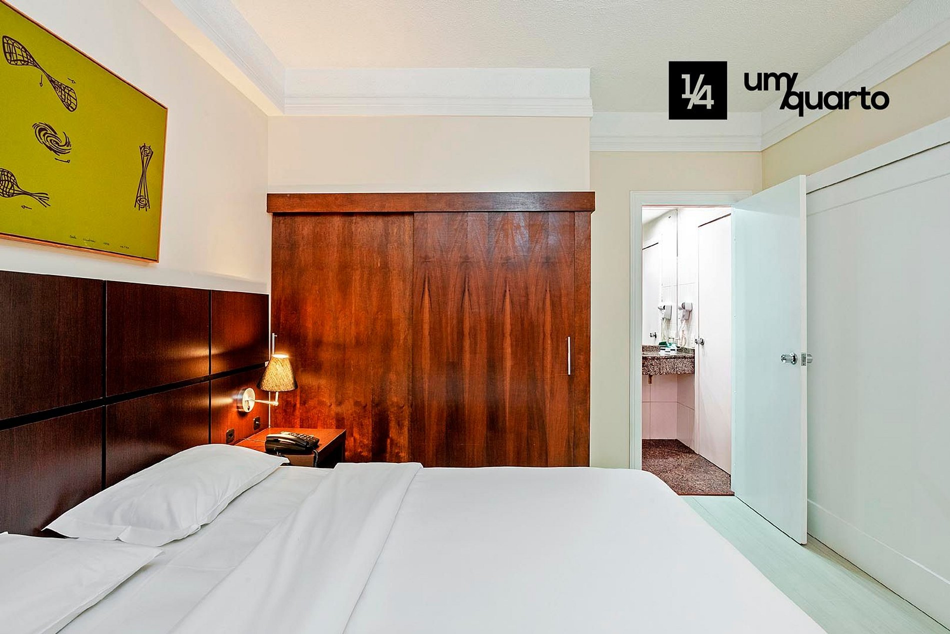 O quarto possui uma cama box de casal, ar-condicionado split, bancada de trabalho, WI-FI gratuito, cofre eletrônico para notebook e secador de cabelo.