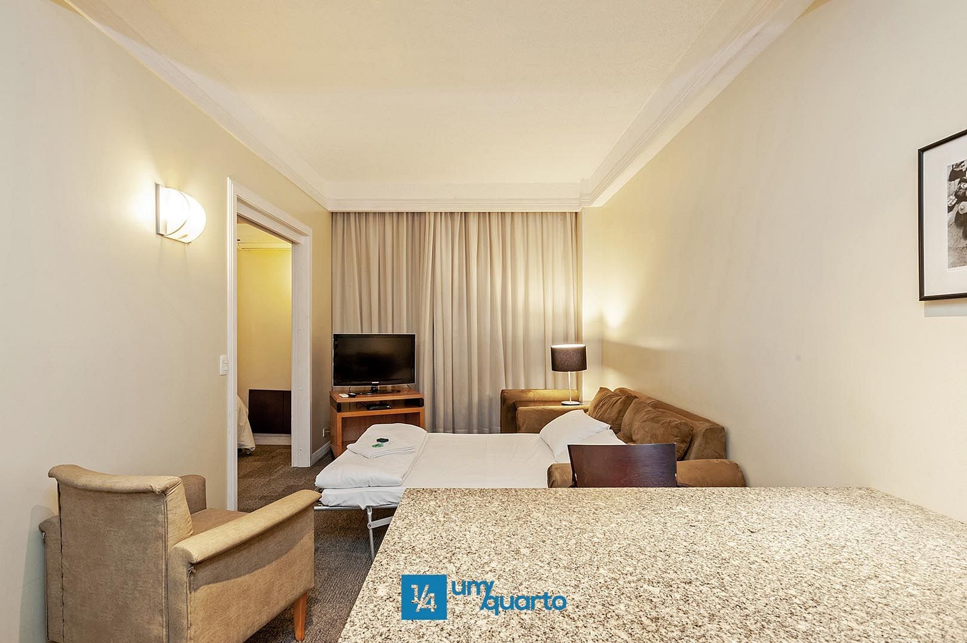 A antessala com minicozinha é equipada com sofá-cama, TV 32" a cabo, cooktop, frigobar, micro-ondas e pia (Os utensílios básicos da cozinha precisam ser retirados na recepção).