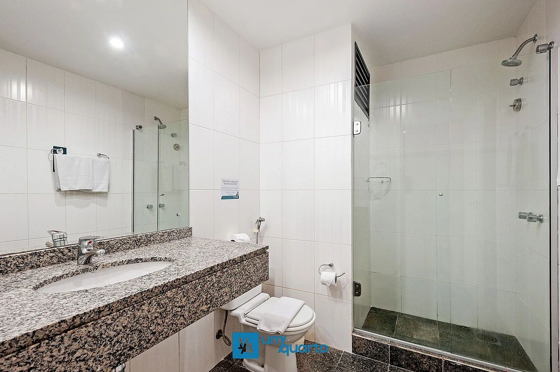 O quarto possui duas camas box de solteiro, ar-condicionado split, bancada de trabalho, WI-FI gratuito, cofre eletrônico para notebook e secador de cabelo.