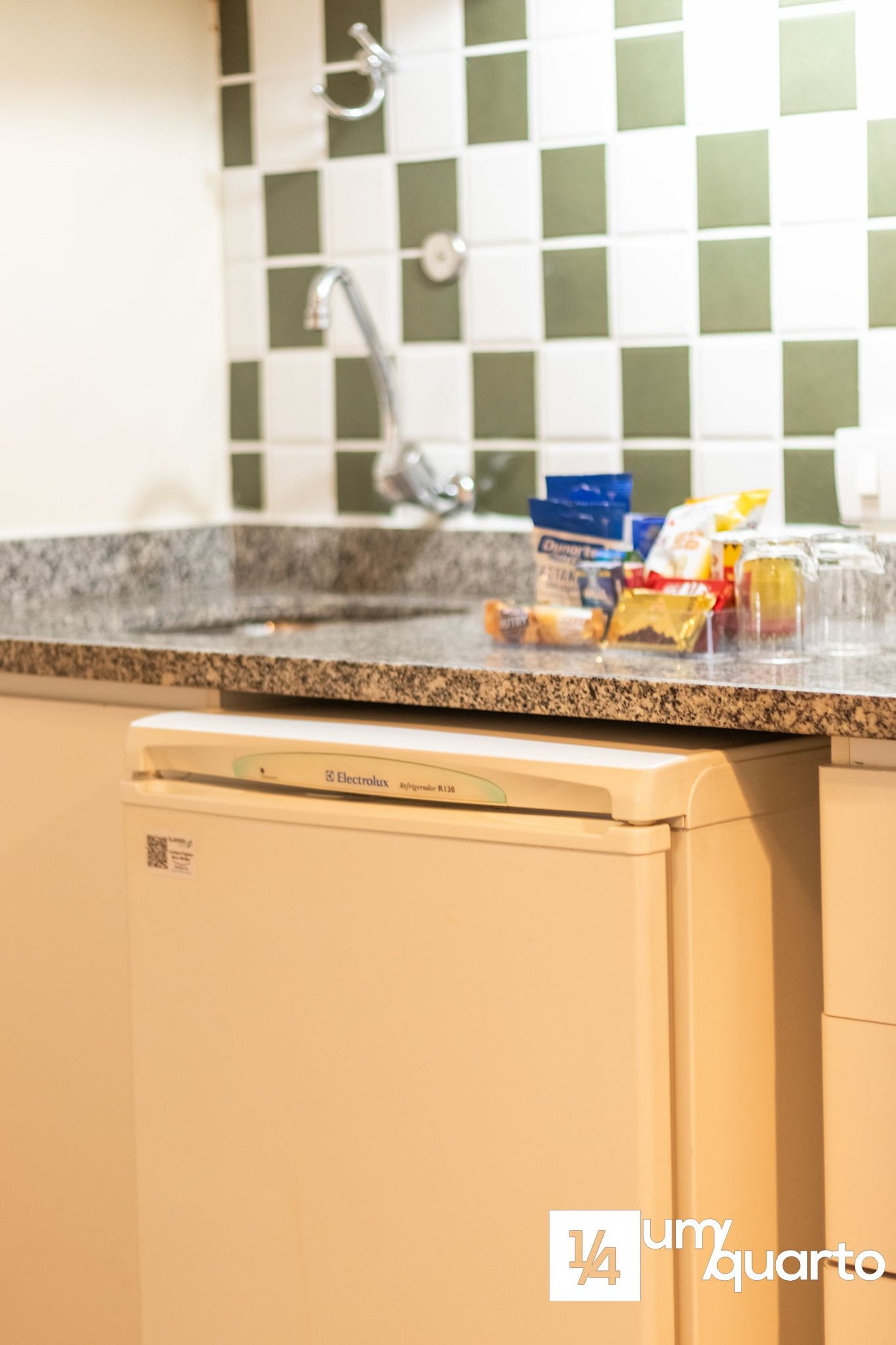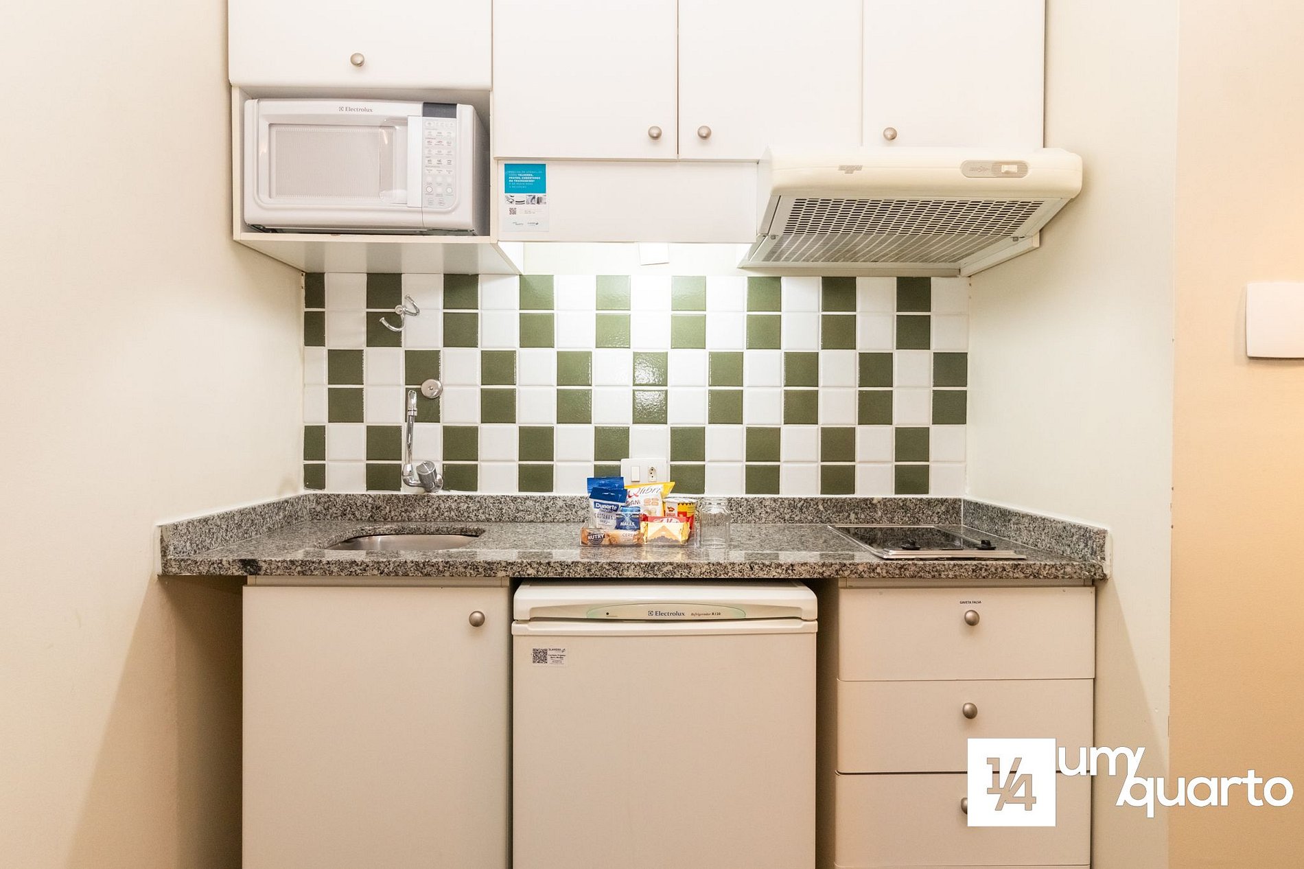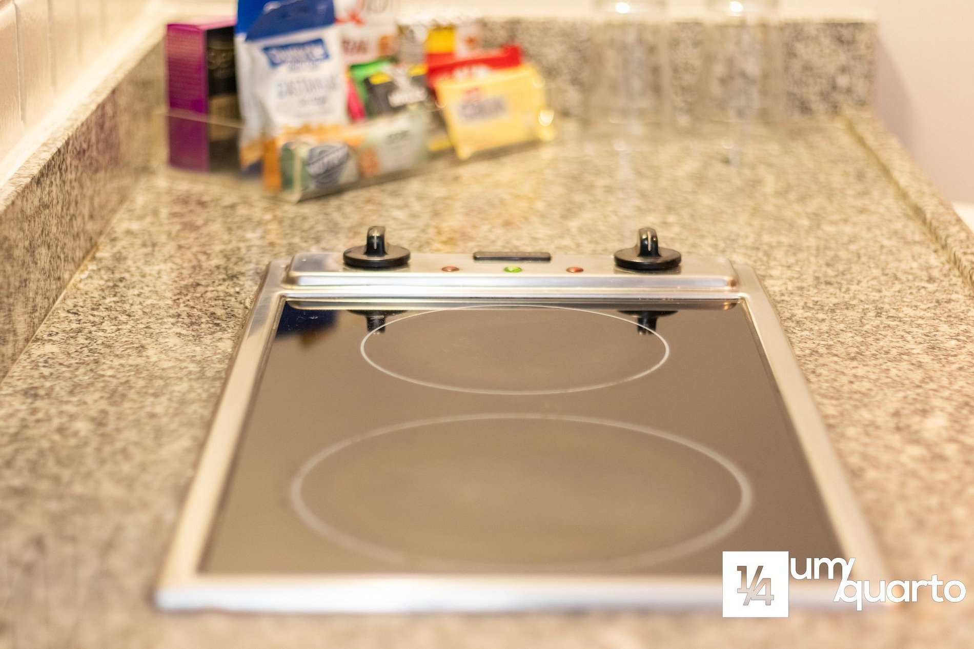 A antessala com minicozinha é equipada com sofá-cama, TV 32" a cabo, cooktop, frigobar, micro-ondas e pia (Os utensílios básicos da cozinha precisam ser retirados na recepção).