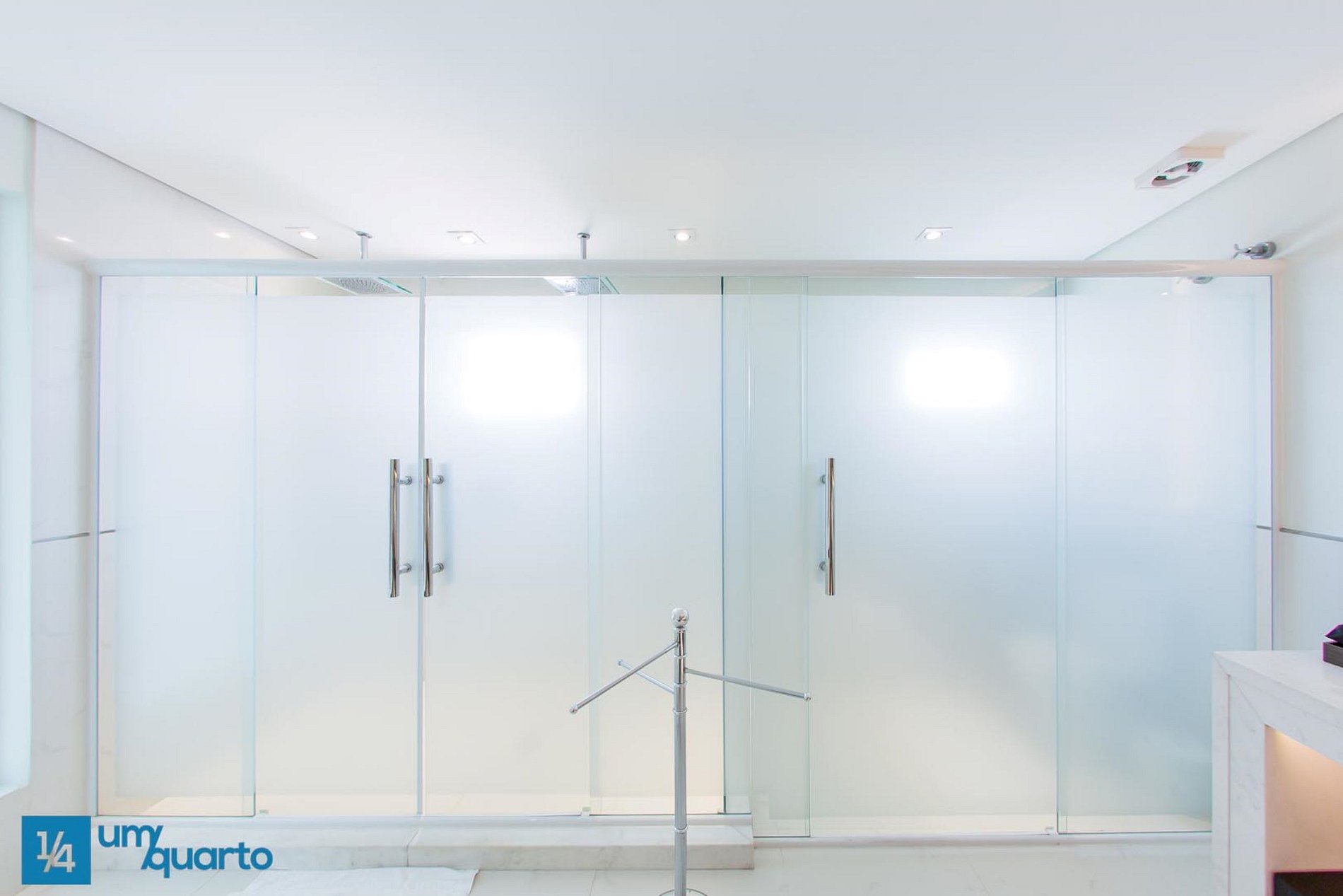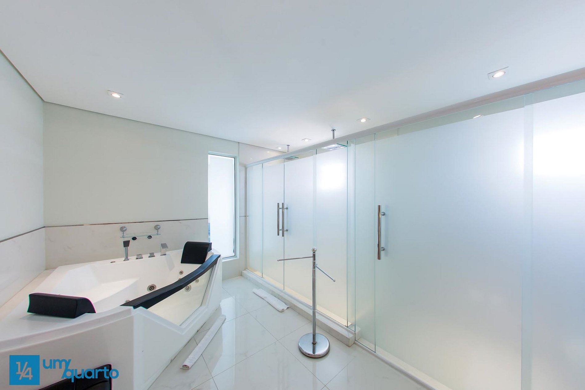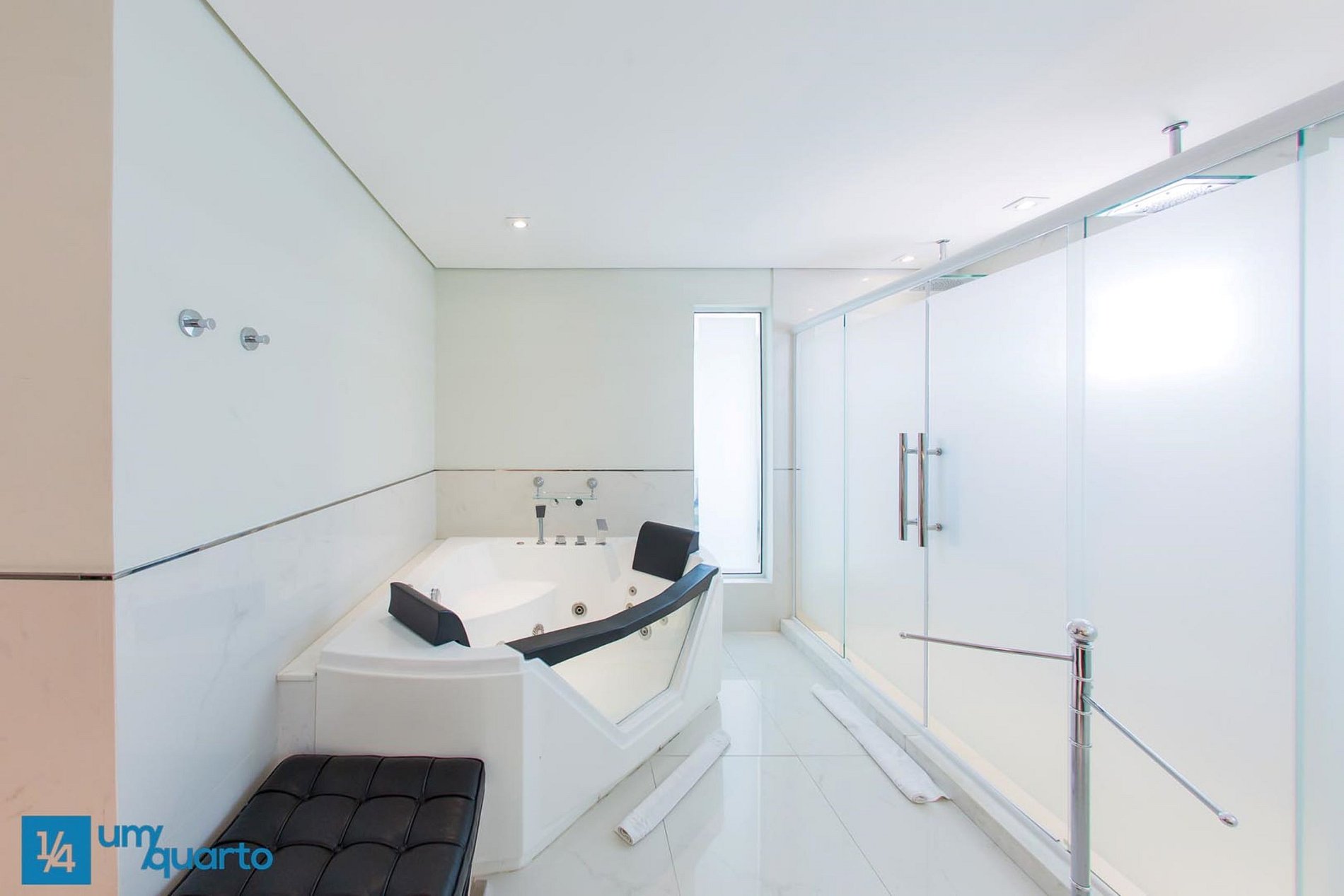 Na Suíte Manhattan possui um amplo banheiro com banheira de hidromassagem, dois chuveiros e duas pias.
