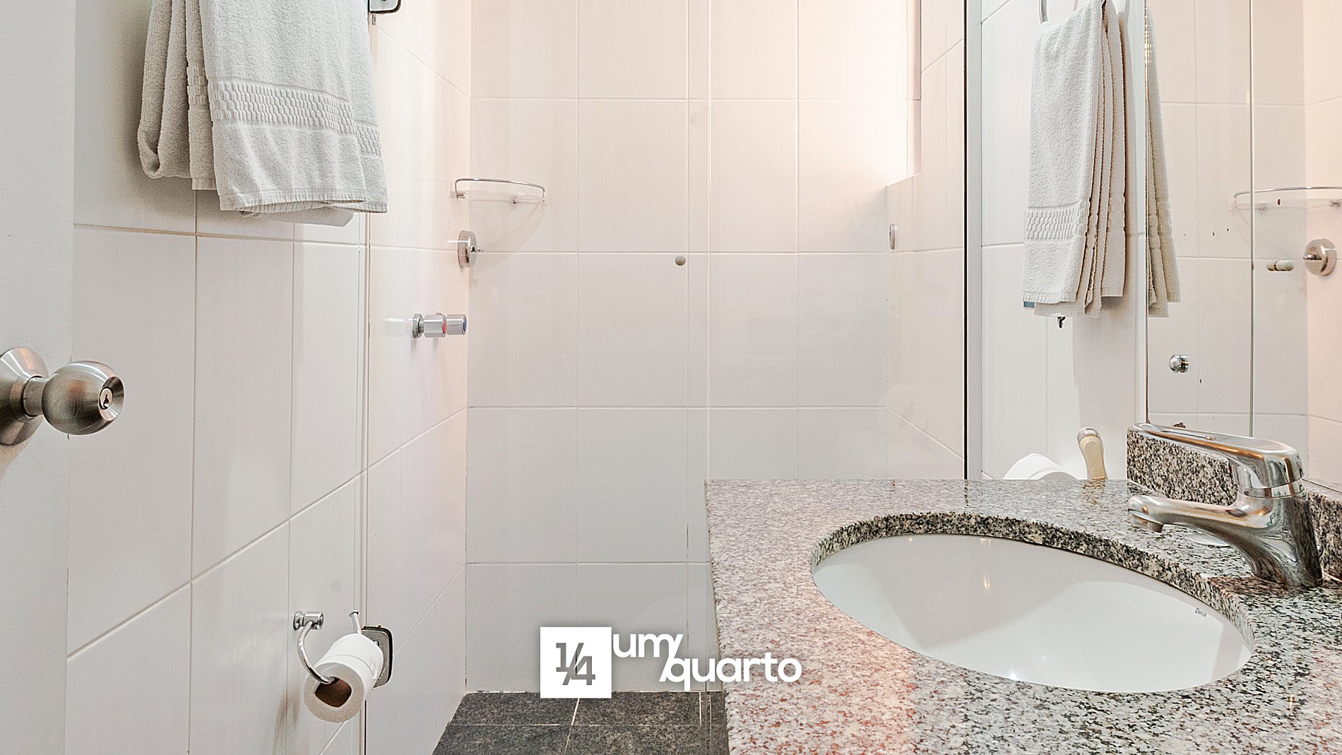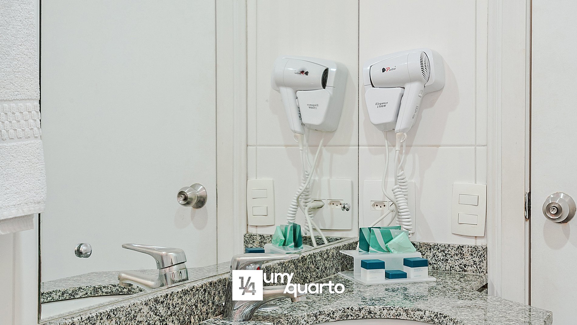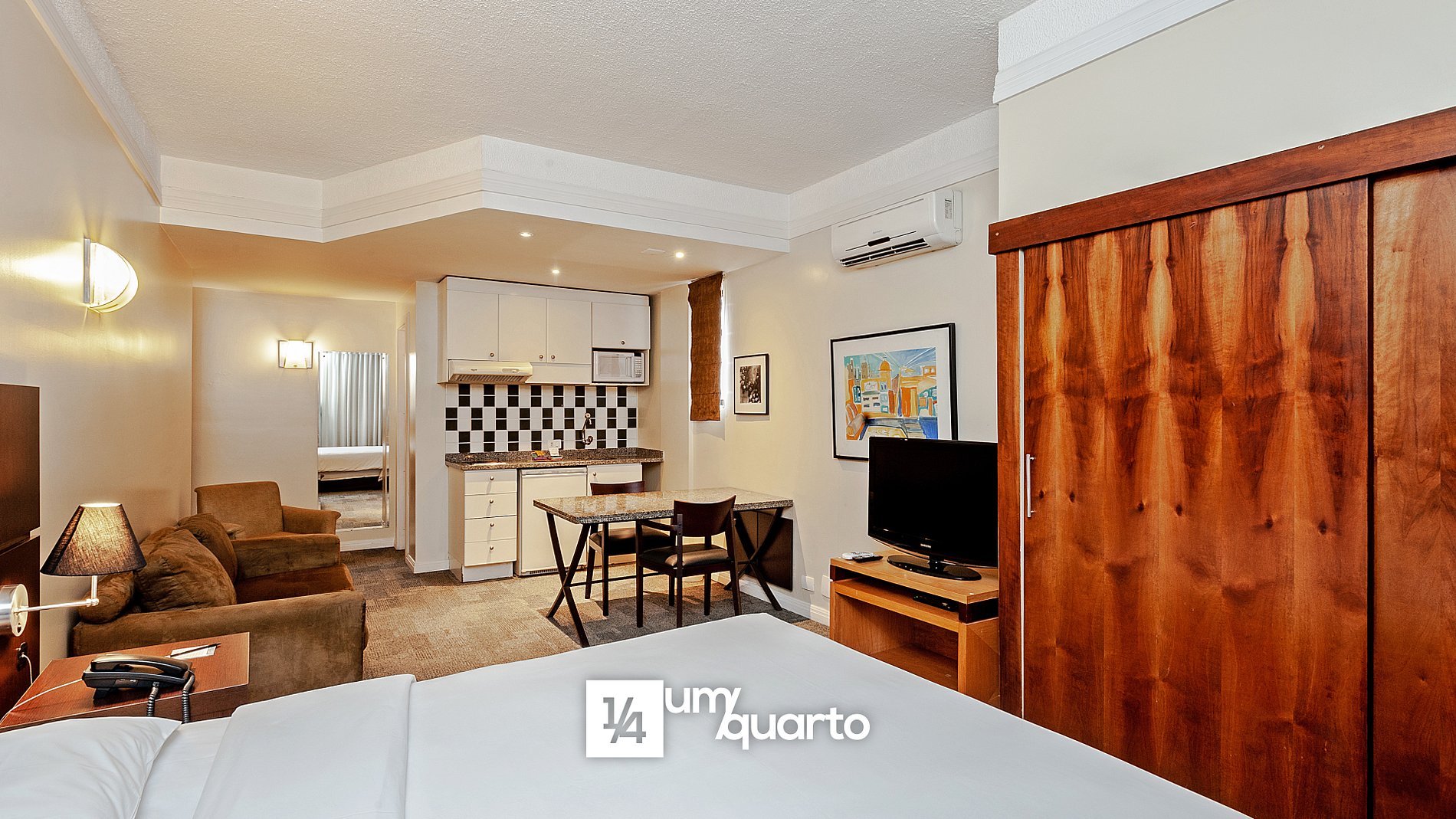 O apartamento conta ainda com uma cama box de casal, bancada de trabalho, WI-FI gratuito, cofre eletrônico para notebook, ar-condicionado split, TV 32” a cabo, sofá e secador de cabelo.