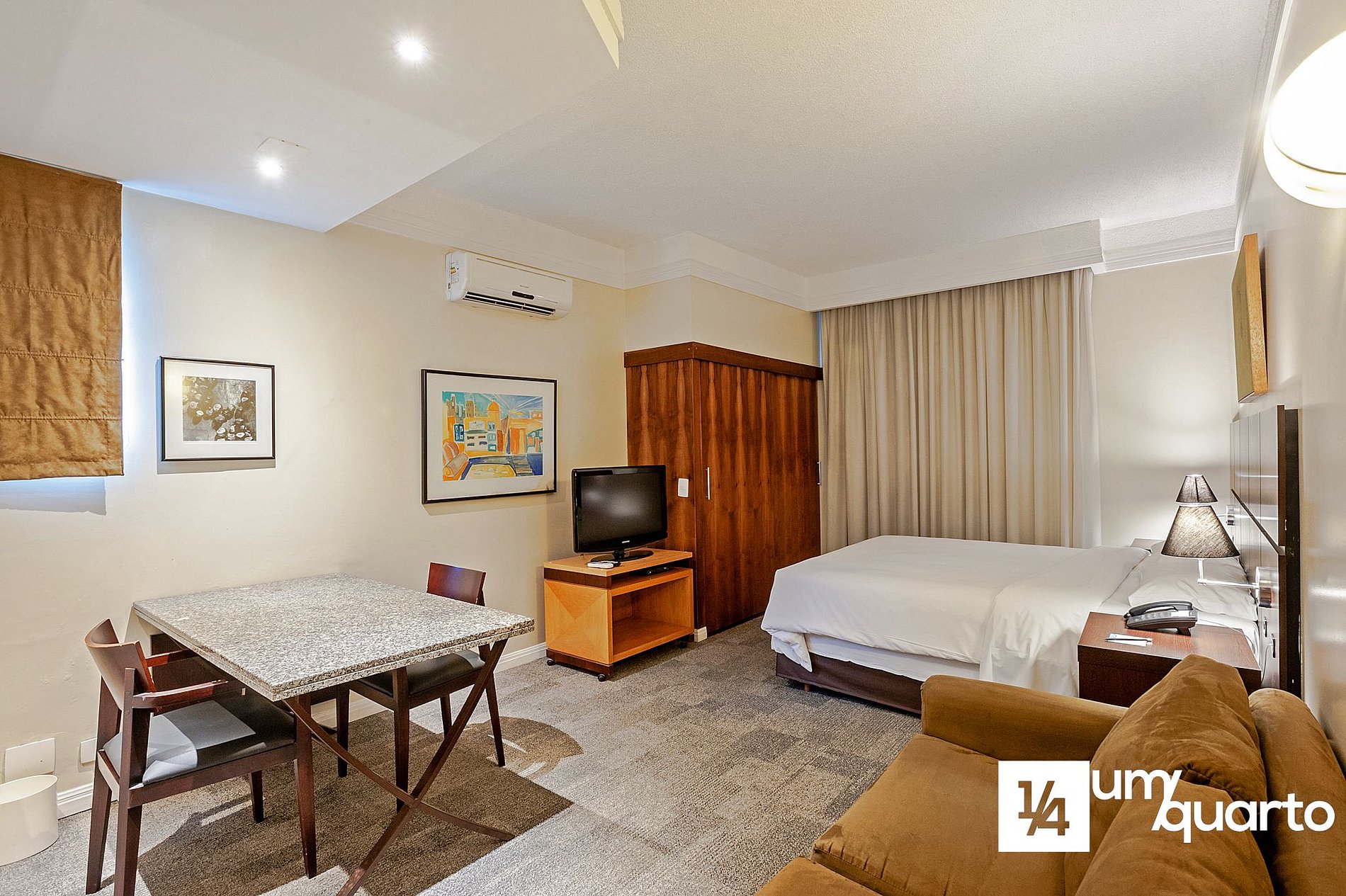 O apartamento conta ainda com uma cama box de casal, bancada de trabalho, WI-FI gratuito, cofre eletrônico para notebook, ar-condicionado split, TV 32” a cabo, sofá e secador de cabelo.
