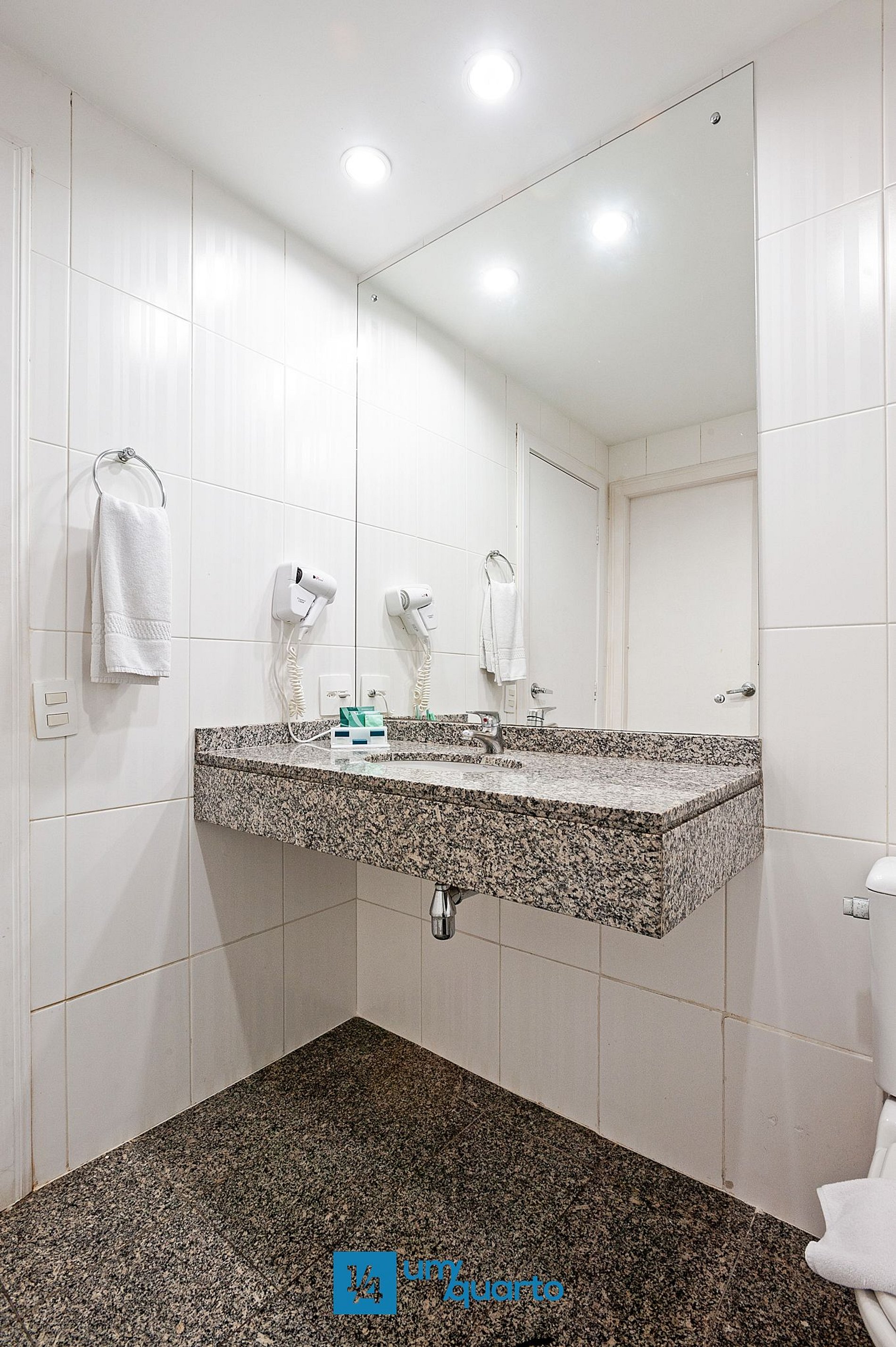 O quarto possui duas camas box de solteiro, ar-condicionado split, bancada de trabalho, WI-FI gratuito, cofre eletrônico para notebook e secador de cabelo.