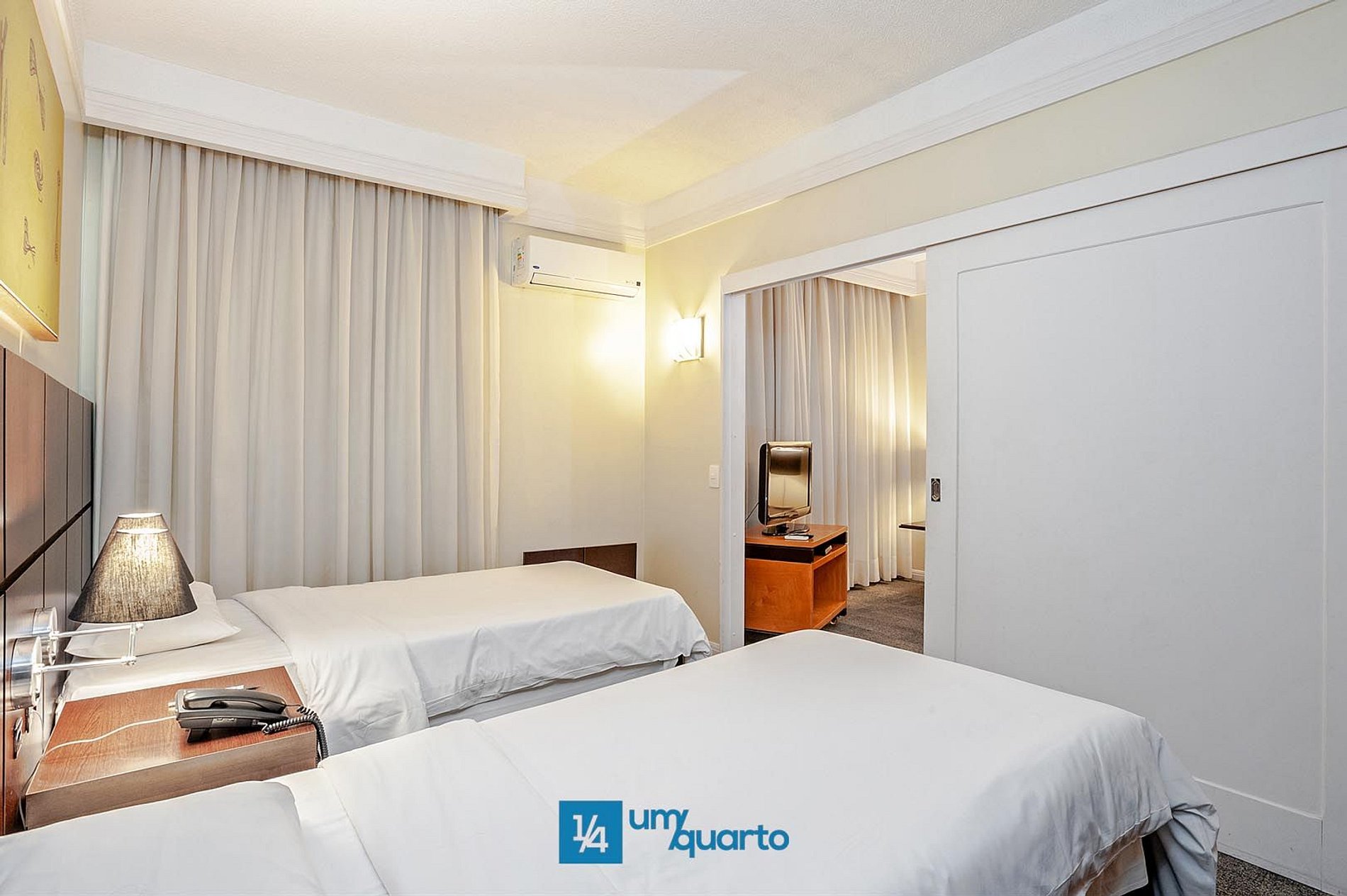 O quarto possui duas camas box de solteiro, ar-condicionado split, bancada de trabalho, WI-FI gratuito, cofre eletrônico para notebook e secador de cabelo.