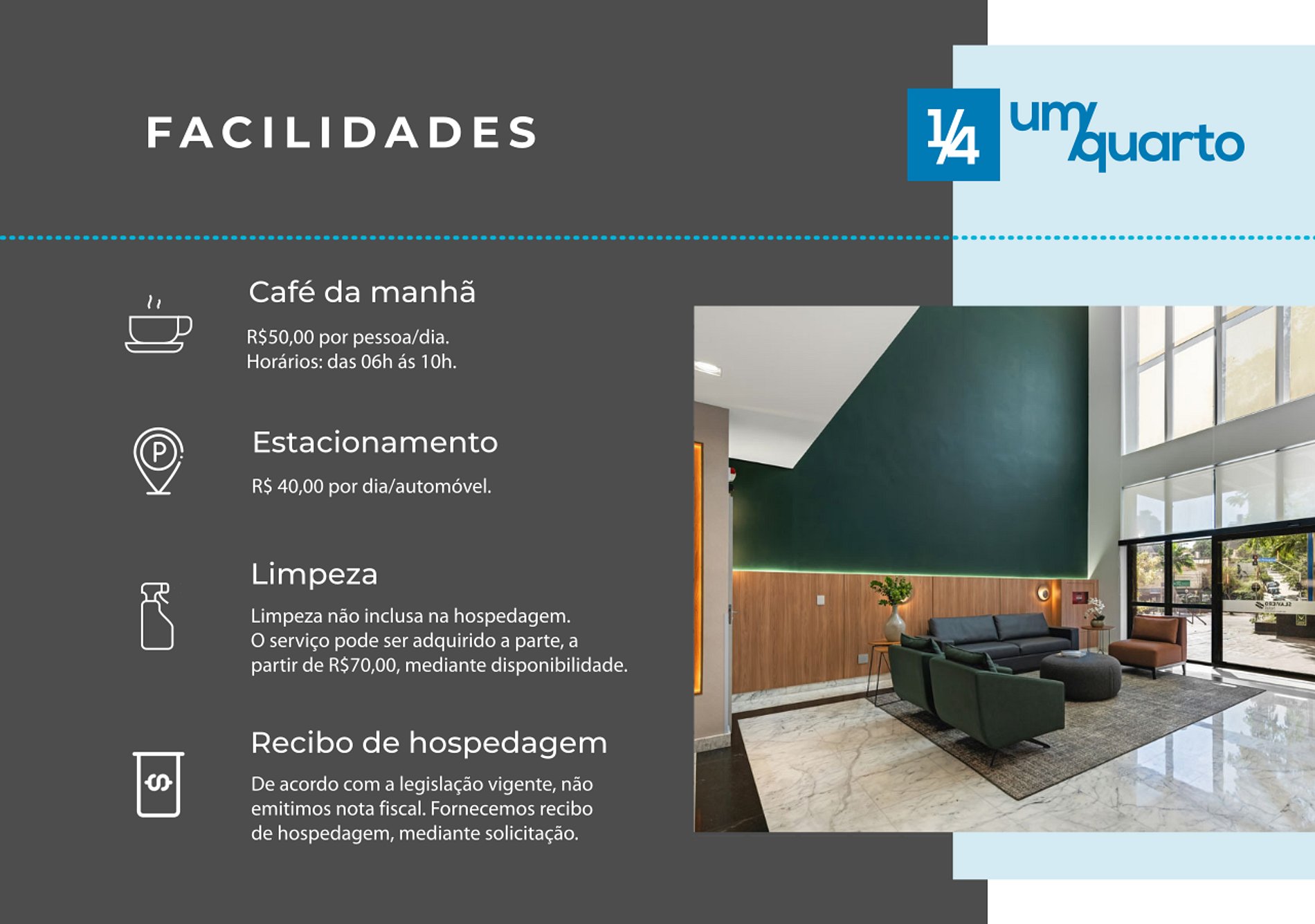 As comodidades extras como estacionamento, café da manhã e serviço de quarto são todas cobradas a parte, mediante a confirmação de disponibilidade e valores diretamente com a recepção do hotel.