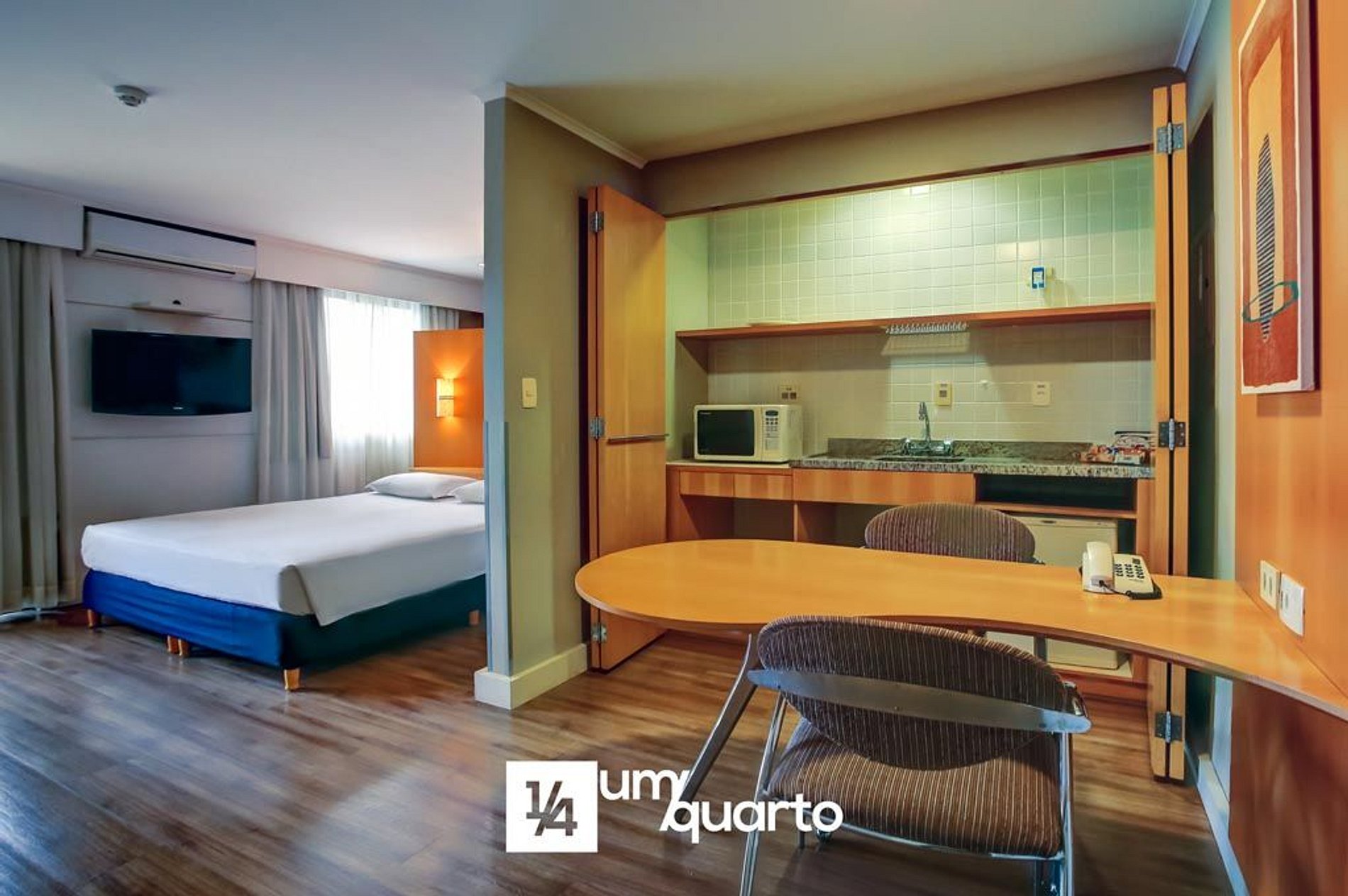 Amplo quarto de 35m², equipado com 1 cama de casal, varanda e mini cozinha, micro-ondas e frigobar, ar condicionado Split, TV tela plana à cabo, mesa de trabalho e WiFi gratuito.