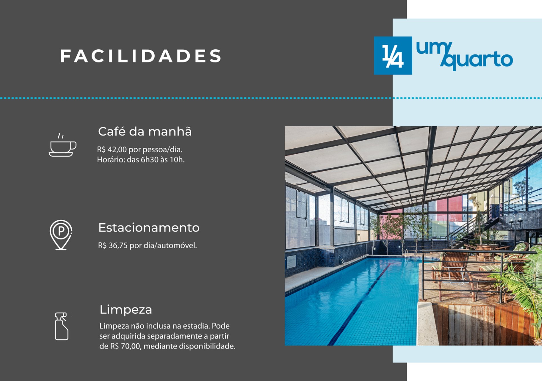 As comodidades extras como Estacionamento, Café da manhã e Limpeza da unidade são todas cobradas a parte, mediante a confirmação de disponibilidade e valores com a recepção. Poderá ser solicitado durante a hospedagem e o pagamento é realizado diretamente na recepção.