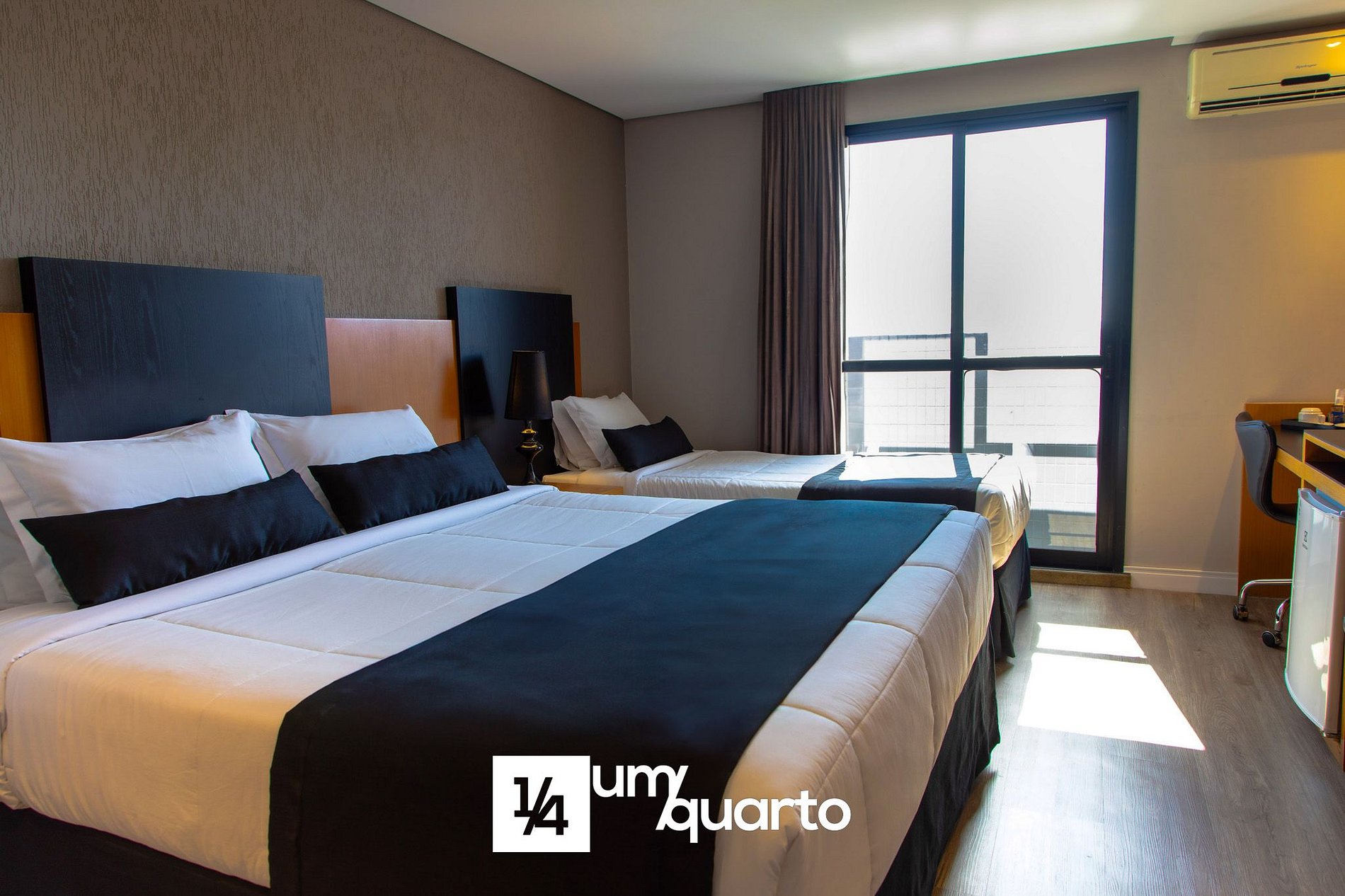 Quarto com decoração moderna, equipado com 1 cama de casal e 1 cama de solteiro, ar condicionado split, TV a cabo, mesa de trabalho e WiFi gratuito.