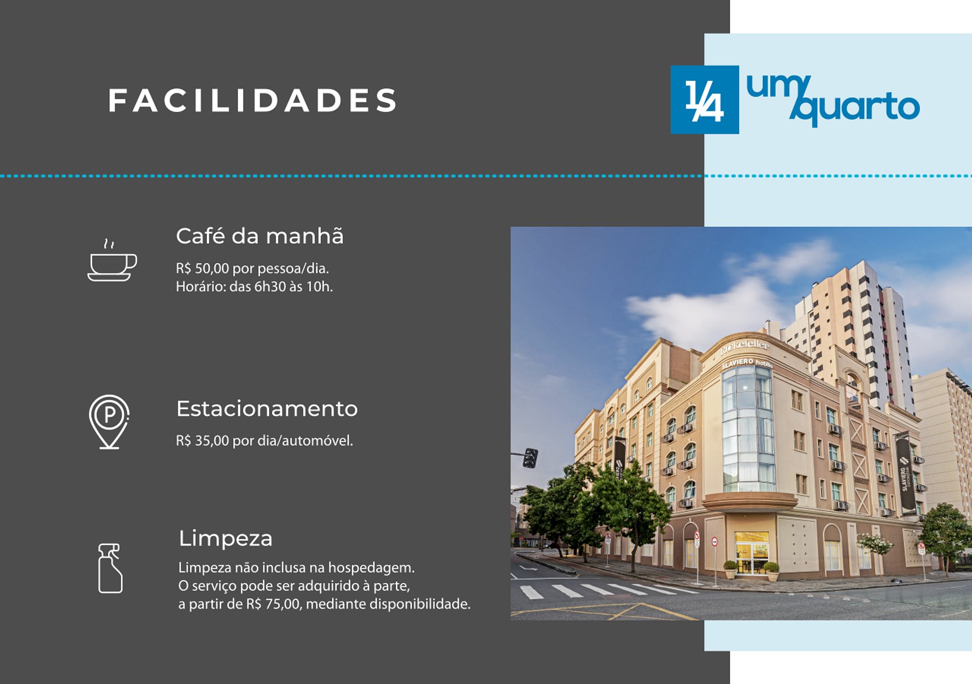 As comodidades extras como estacionamento, café da manhã e serviço de quarto são todas cobradas a parte, mediante a confirmação de disponibilidade e valores diretamente com a recepção do hotel.