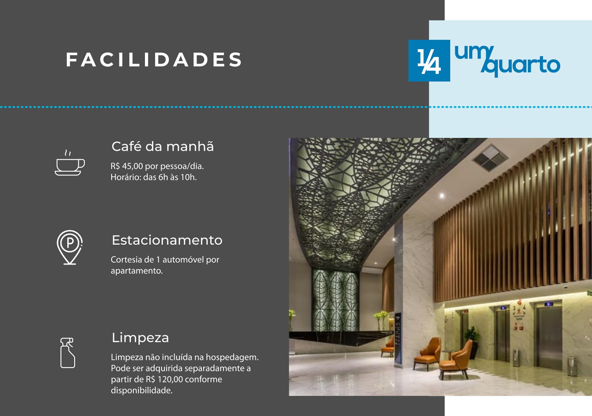 As comodidades extras como: Café da manhã e Limpeza da unidade são todas cobradas a parte, mediante a confirmação de disponibilidade e valores com a recepção.