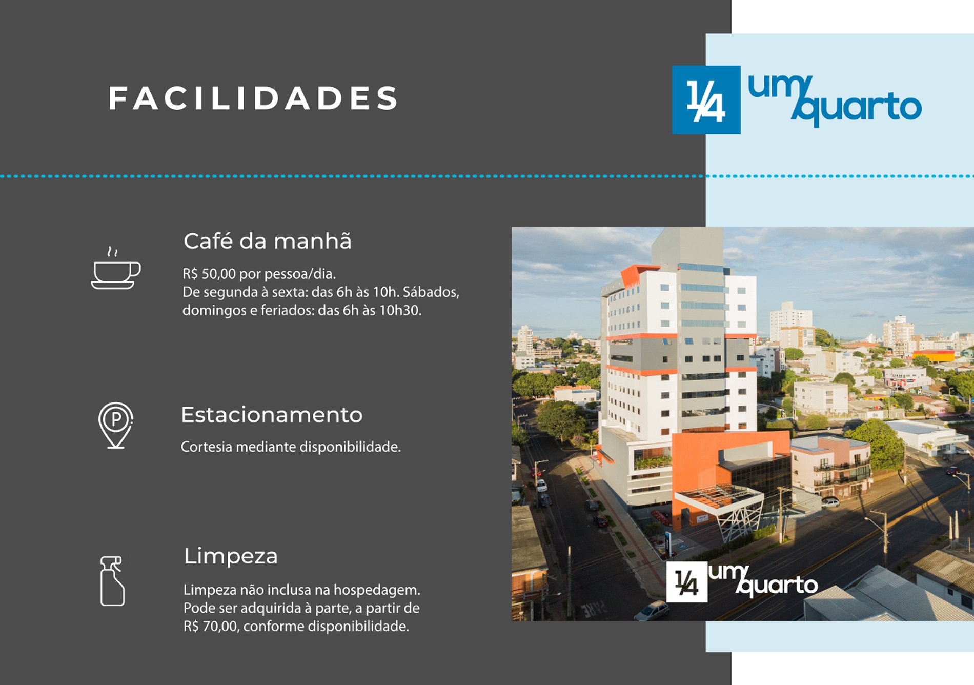 As comodidades extras como Estacionamento, Café da manhã e Limpeza da unidade são todas cobradas a parte, mediante a confirmação de disponibilidade e valores com a recepção. Poderá ser solicitado durante a hospedagem e o pagamento é realizado diretamente na recepção.