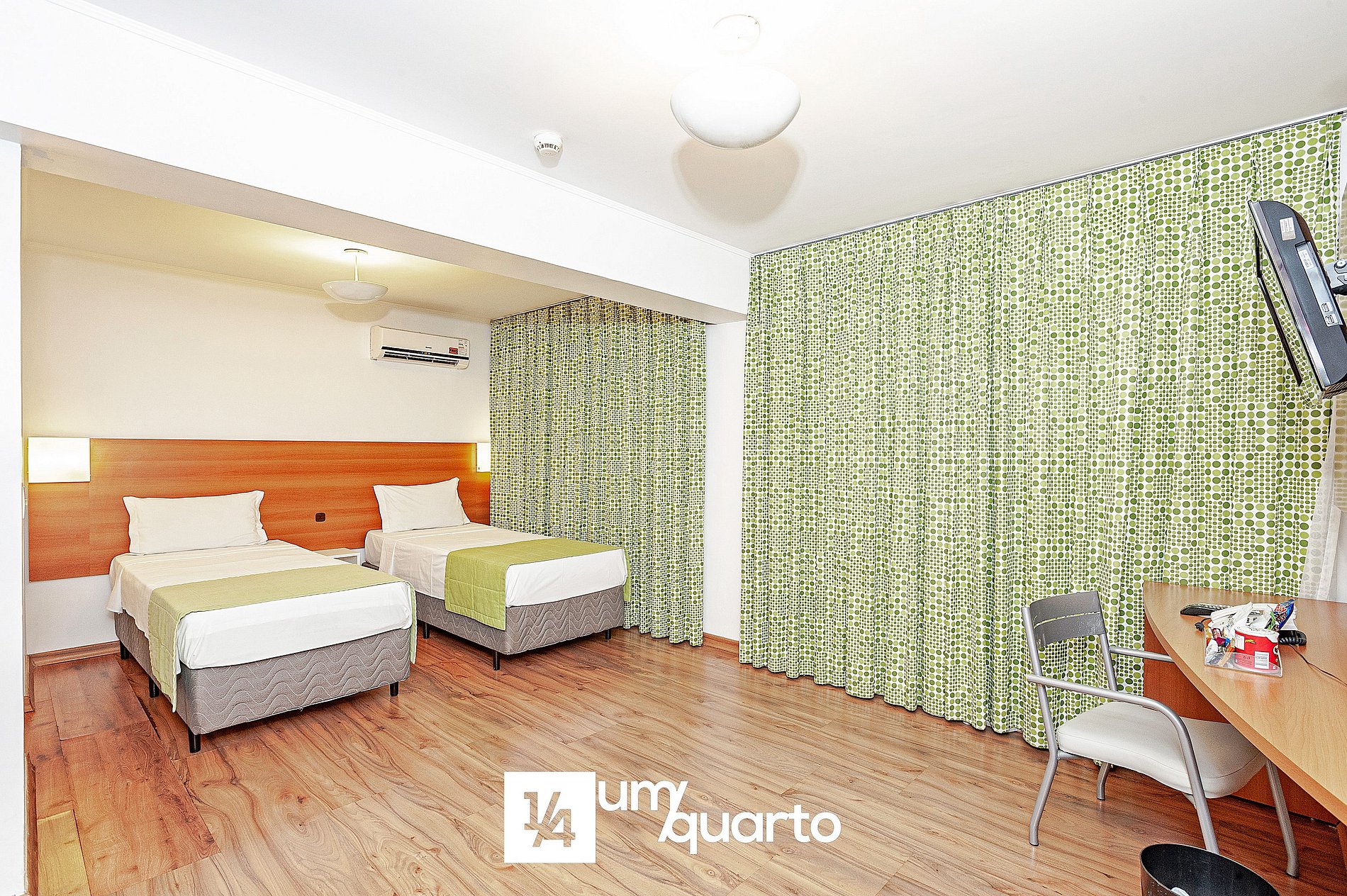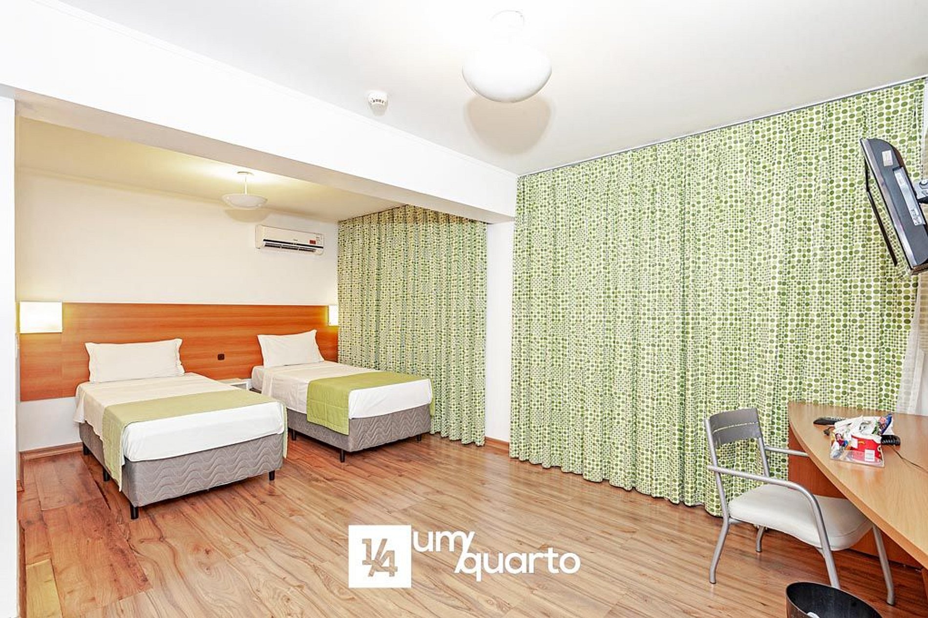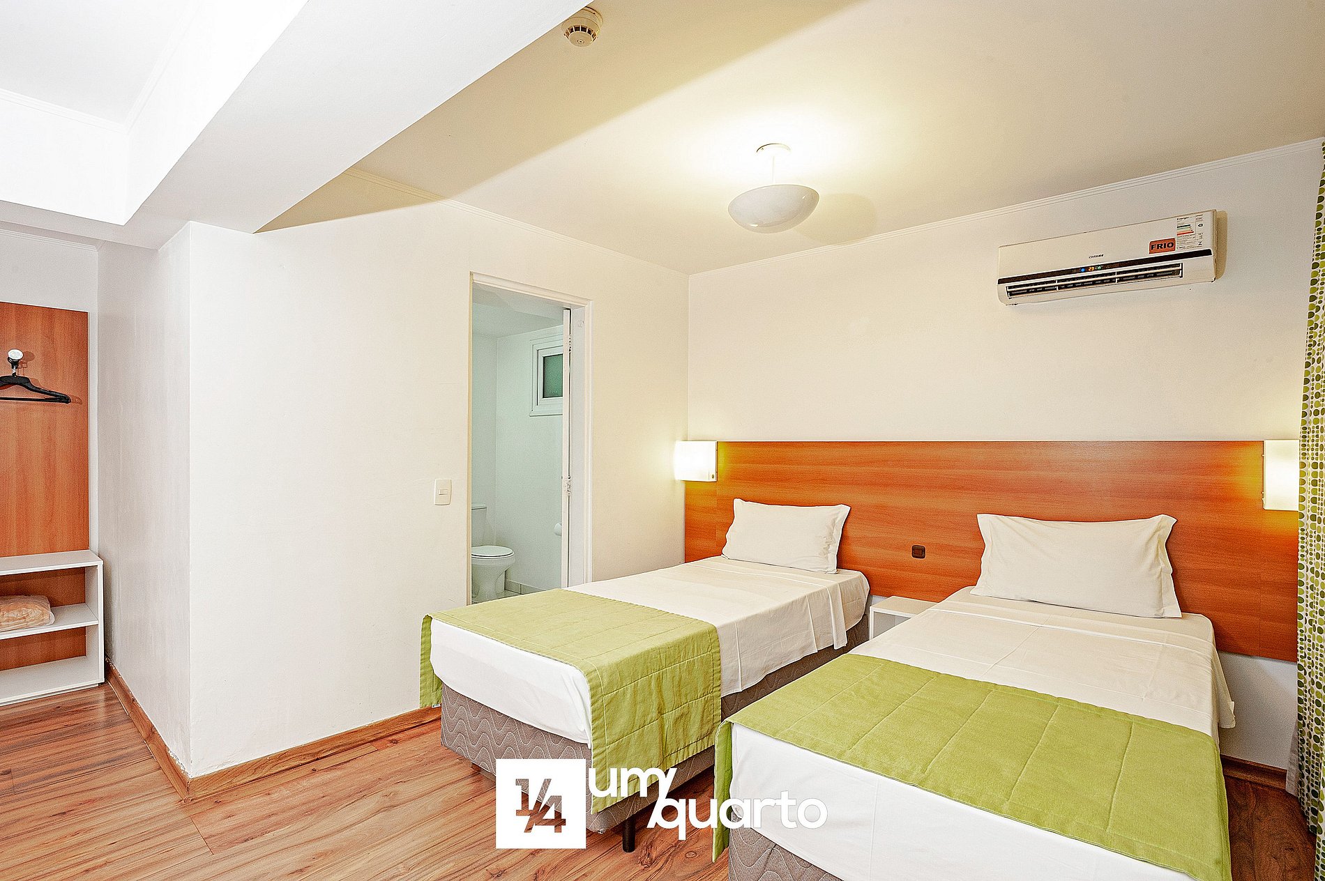 Acomodação mais espaçosa e silenciosa, equipada com 2 camas box de solteiro, TV 32'' a cabo, ar-condicionado split, bancada de trabalho, WI-FI gratuito e secador de cabelo.